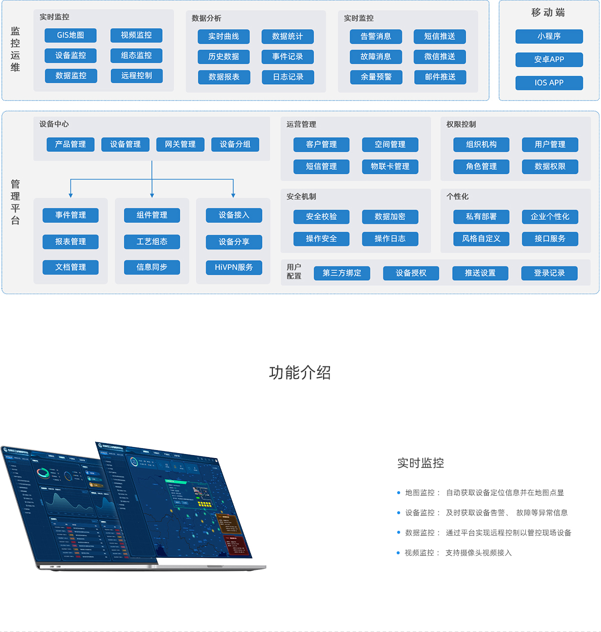 1.1 實時監控 GIS地圖:設備定位信息可自動獲取。 設備監控:及時獲取設備告警、故障等異常信息。 數據監控:還可進行遠程控制以管控現場設備。 視頻監控:支持攝像頭視頻接入。