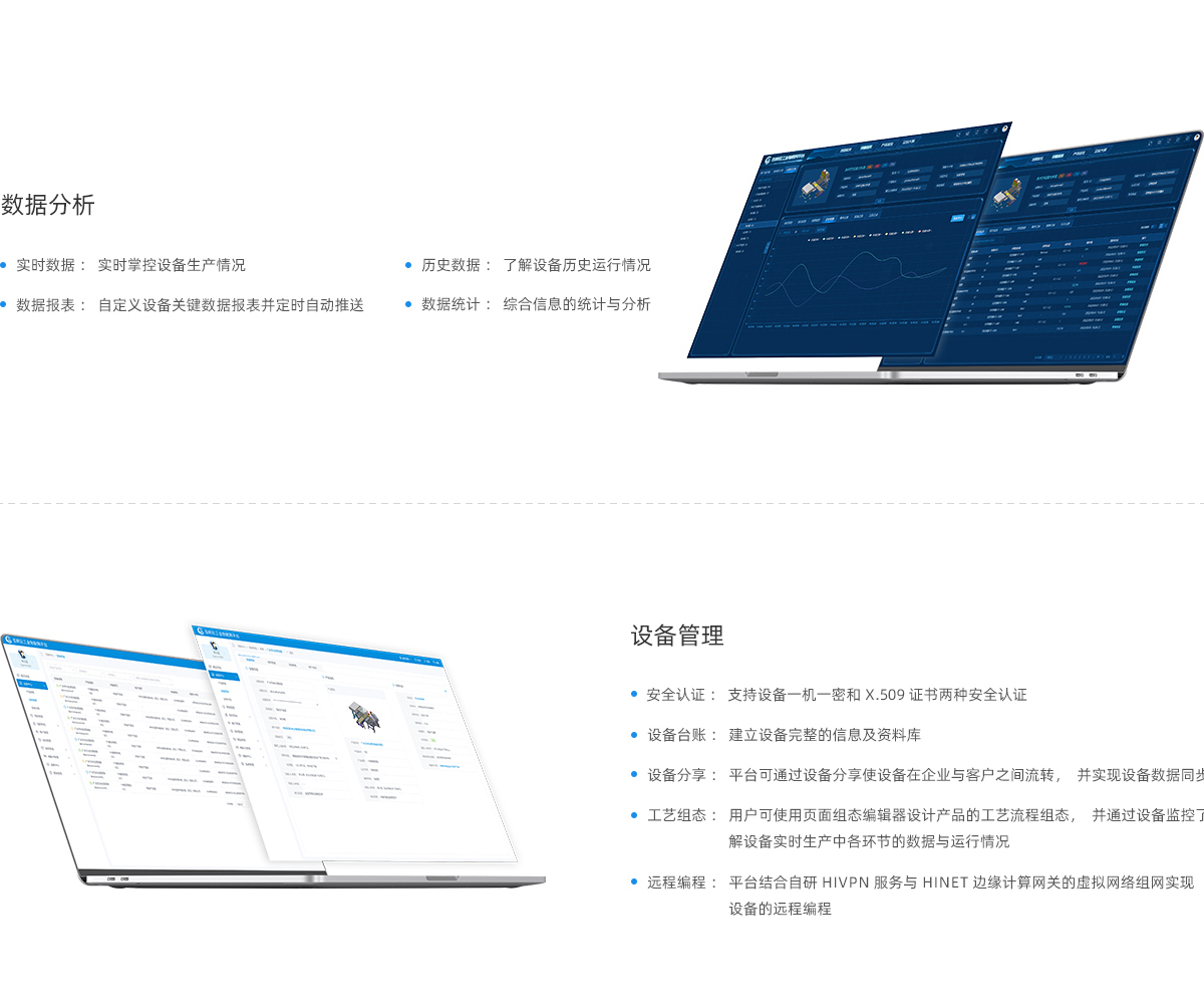 1.2 數據分析 實時數據:實時掌控設備生產情況。 歷史數據:了解設備運行趨勢。 數據報表:自定義設備關鍵數據報表并定時自動推送。 數據統計:綜合信息的統計與分析。
