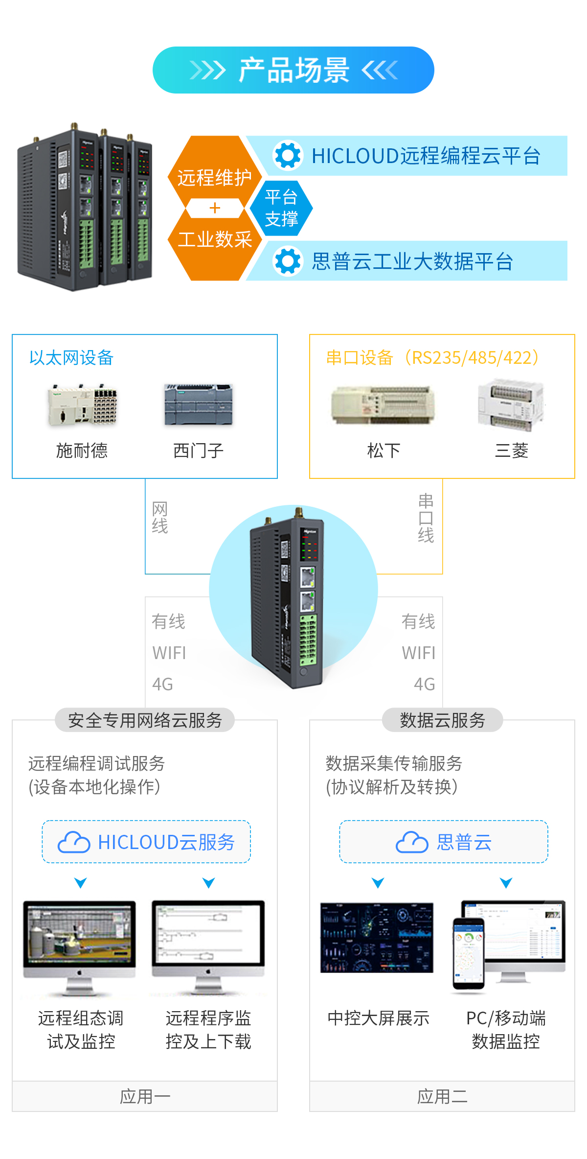 網(wǎng)關可以采集PLC數(shù)據(jù),然后通過MQTT協(xié)議上傳到平臺,通過我們的思普云平臺可以實現(xiàn)對設備運行狀態(tài)和數(shù)據(jù)的監(jiān)控。