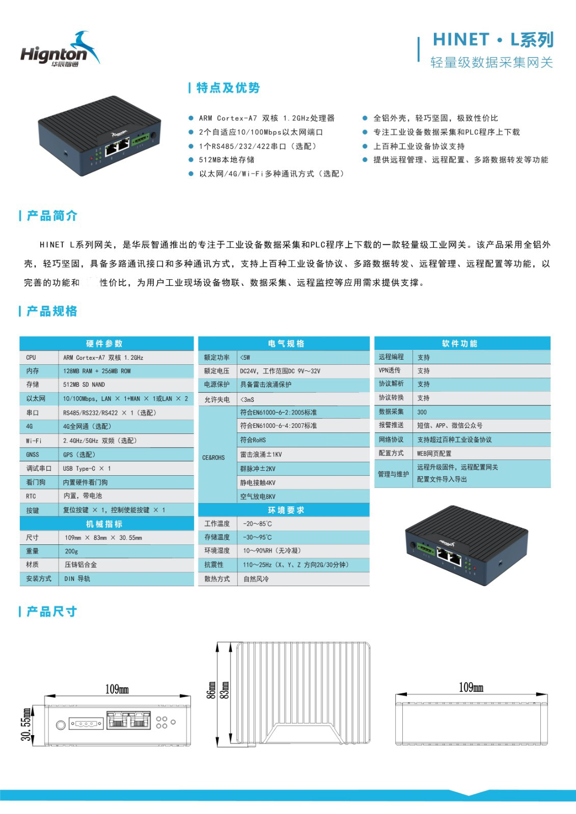 HINET L系列網關,是華辰智通推出的專注于工業設備數據采集和PLC程序上下載的一款輕量級工業網關。該產品采用全鋁外 殼,輕巧堅固,具備多路通訊接口和多種通訊方式,支持上百種工業設備協議、多路數據轉發、遠程管理、遠程配置等功能,以 完善的功能和性價比,為用戶工業現場設備物聯、數據采集、遠程監控等應用需求提供支撐。