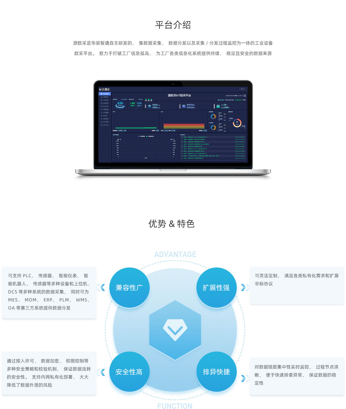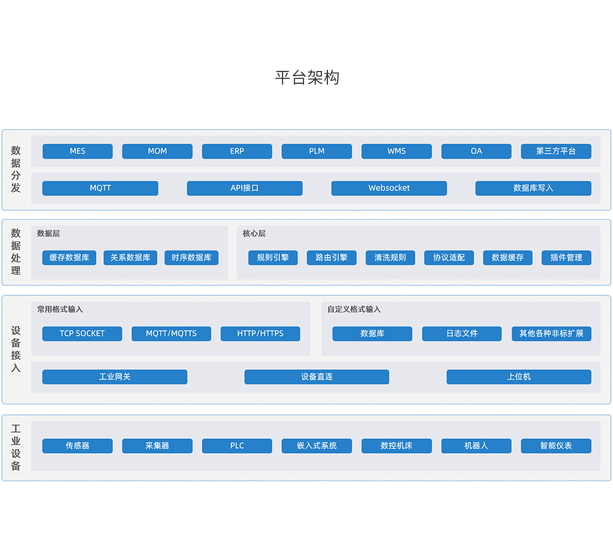 可支持PLC、傳感器、DCS、上位機、數控機床、智能儀表、智能機器人等多種類型的網絡傳輸協議的設備數據采集,也可為各類MES、MOM、ERP、PLM、WMS、OA系統提供數據分發